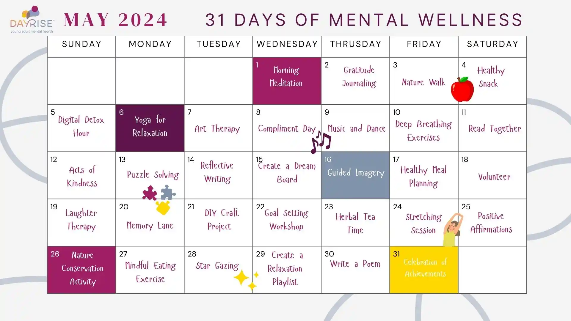 As we wrap up our “31 Days of Mental Wellness,” we hope you’ve found these daily activities valuable and enriching. This journey was designed not just to observe Mental Health Month, but to provide you and your family with tools and ideas that can be carried forward throughout the year. Remember, the path to mental wellness is ongoing, and small daily steps can lead to significant improvements. We encourage you to continue exploring these activities, revisit your favorites, and keep sharing your experiences. At Dayrise Wellness, we are committed to supporting you every step of the way towards a healthier, happier life. Stay tuned for more resources and support, and remember, we’re always here to help light your path to mental wellness.